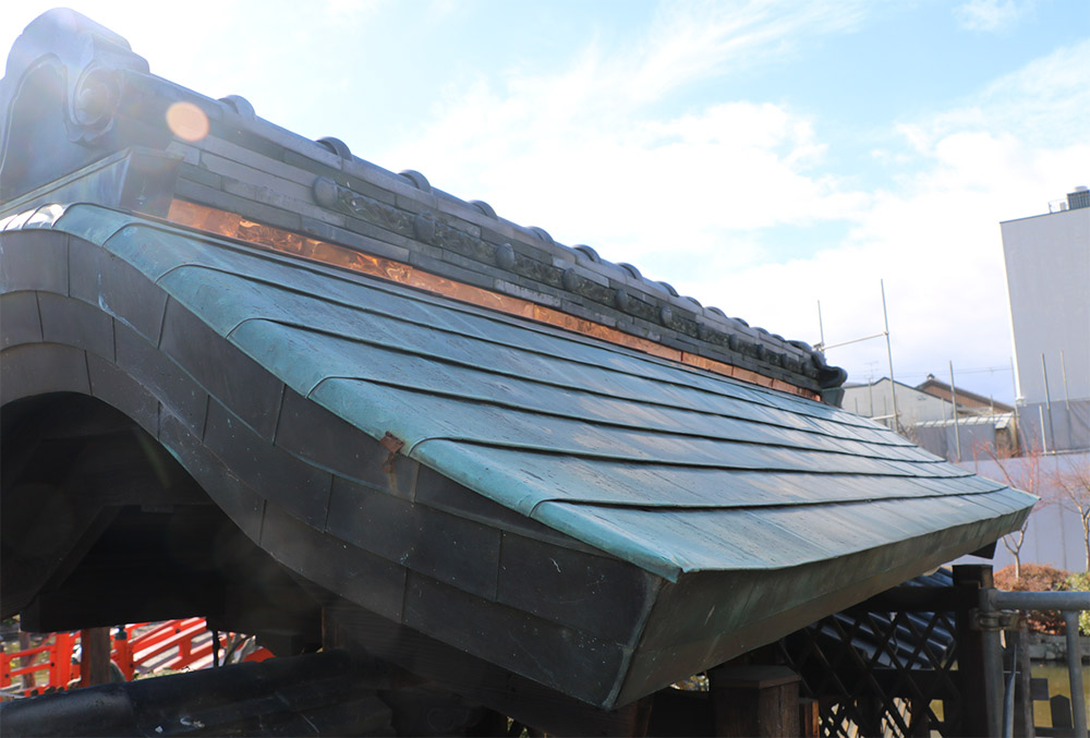 善女龍王社本殿と中門の屋根の銅板葺が、瓦から出る灰汁により、 腐食し傷んできております。