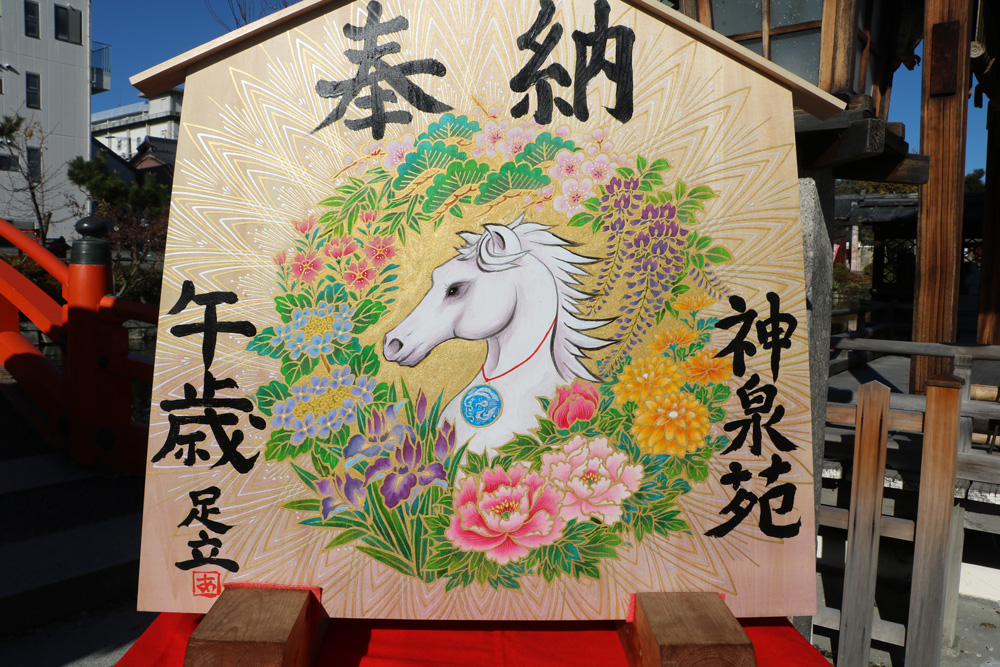 ○12月21日 京友禅作家の足立茂様により、午歳の絵馬をご奉納いただきました。愛らしい白馬のまわりを、牡丹や菊、菖蒲や藤などの花が鮮やかに彩られています。 御朱印 も授与しております。 |