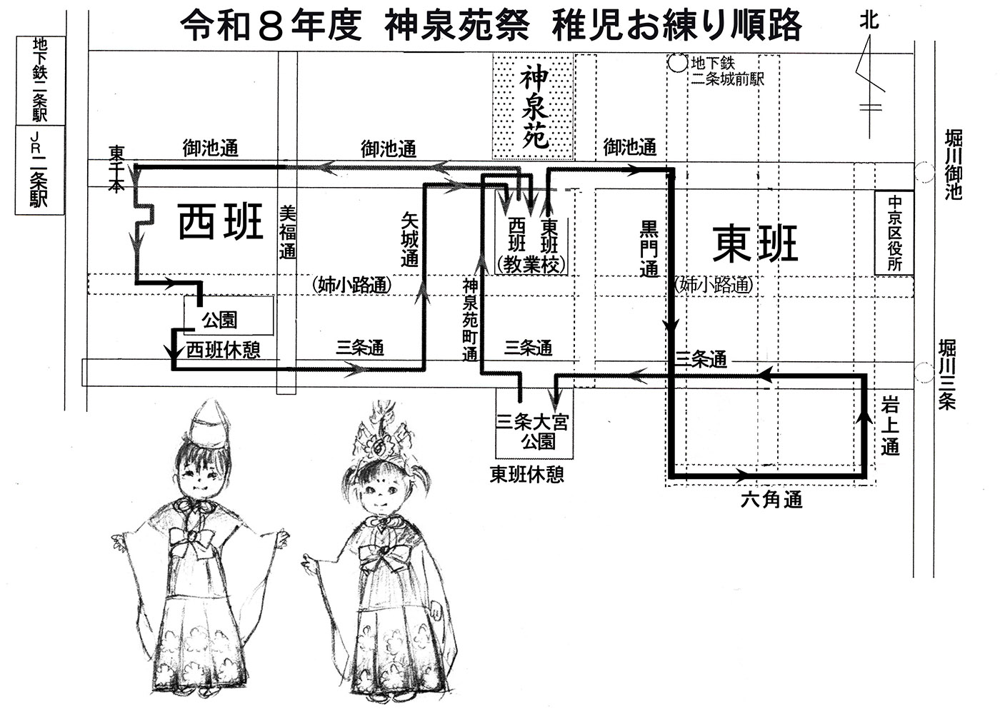 御神輿の前で龍神様に無事を祈り、教業小学校から東西二手に分かれて、学区をお練りします。 お稚児さんの拝礼とお練り(行列)をして、 一生の思い出として下さい。どうぞご近所お誘い合わせの上、ふるってご参加下さいますようお待ち申し上げます。 ○お申し込み方法 参加費:一名6,000円 (貸衣装、記念品代ふくむ) 申込締め切り:令和8年4月25日 定員:40名(定員になり次第受付終了) 申込先:神泉苑寺務所(TEL 075-821-1466) メールお問い合わせ 申込用紙PDF shinsenen1200@mbox.kyoto-inet.or.jp |