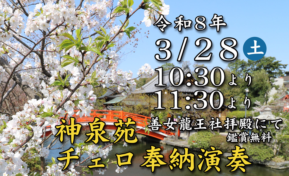 3月28日(土) 10:30〜、11:30〜 善女龍王社拝殿にて、チェロの奉納演奏がございます。 お花見をしながら、優雅な音色をおたのしみください。 チェロ奏者 石塚 俊 様 |