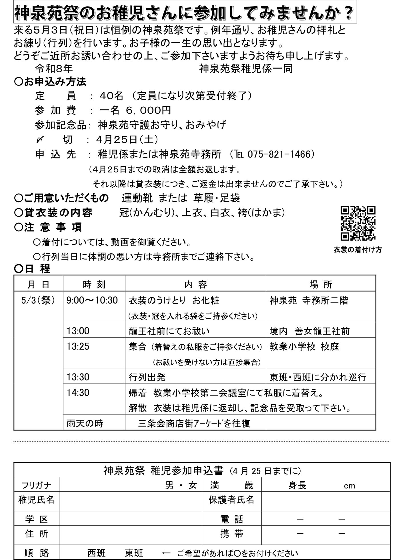 御神輿の前で龍神様に無事を祈り、教業小学校から東西二手に分かれて、学区をお練りします。 お稚児さんの拝礼とお練り(行列)をして、 一生の思い出として下さい。どうぞご近所お誘い合わせの上、ふるってご参加下さいますようお待ち申し上げます。 ○お申し込み方法 参加費:一名6,000円 (貸衣装、記念品代ふくむ) 申込締め切り:令和8年4月25日 定員:40名(定員になり次第受付終了) 申込先:神泉苑寺務所(TEL 075-821-1466) メールお問い合わせ 申込用紙PDF shinsenen1200@mbox.kyoto-inet.or.jp |
