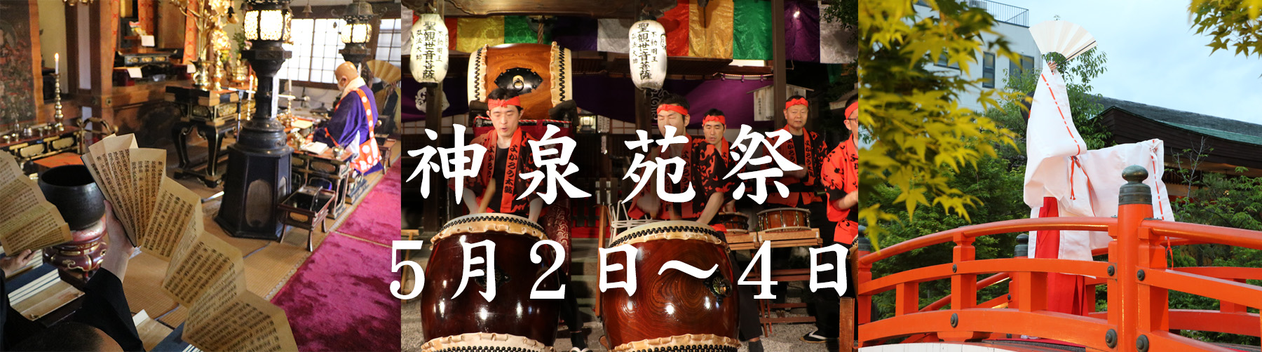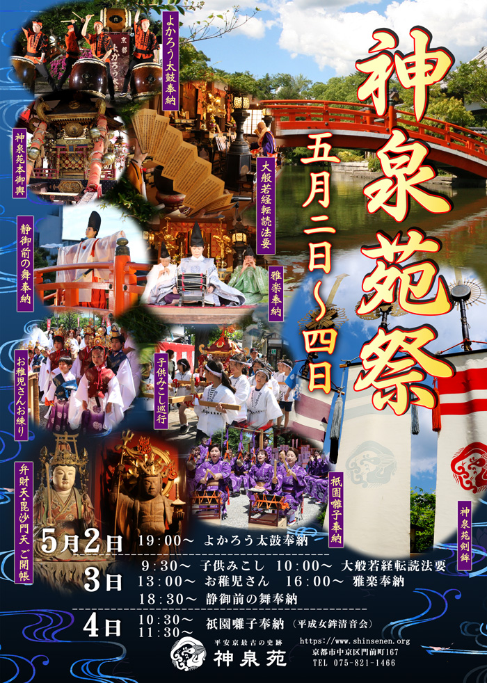 ○神泉苑祭が行われます。 善女龍王社の拝殿には江戸時代に造られた御神輿を奉安し、 境内には三本の剣鉾が建立されます。剣鉾と旗はこの度、修理を行いました。 御神輿や剣鉾は4月29日の昼から5月4日昼すぎまでご覧いただけます。 本堂での大般若経転読法要や、よかろう太鼓・雅楽の奉納演奏、 祇園囃子など諸行事がありますので、どうぞお気軽に御参詣ください。 |