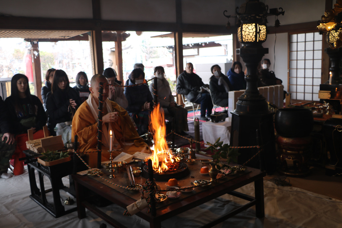 不動明王様の御前にて、火の神様を壇上におまねきし、 供物を炉に投じて、皆様のお願いごとの書かれた護摩木を 焚き上げご祈念申し上げました。御参詣いただきありがとうございました。