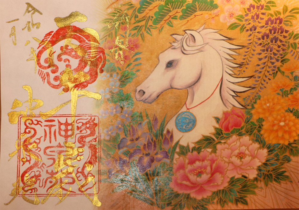 ○12月21日 京友禅作家の足立茂様により、午歳の絵馬をご奉納いただきました。愛らしい白馬のまわりを、牡丹や菊、菖蒲や藤などの花が鮮やかに彩られています。 御朱印 も授与しております。 |